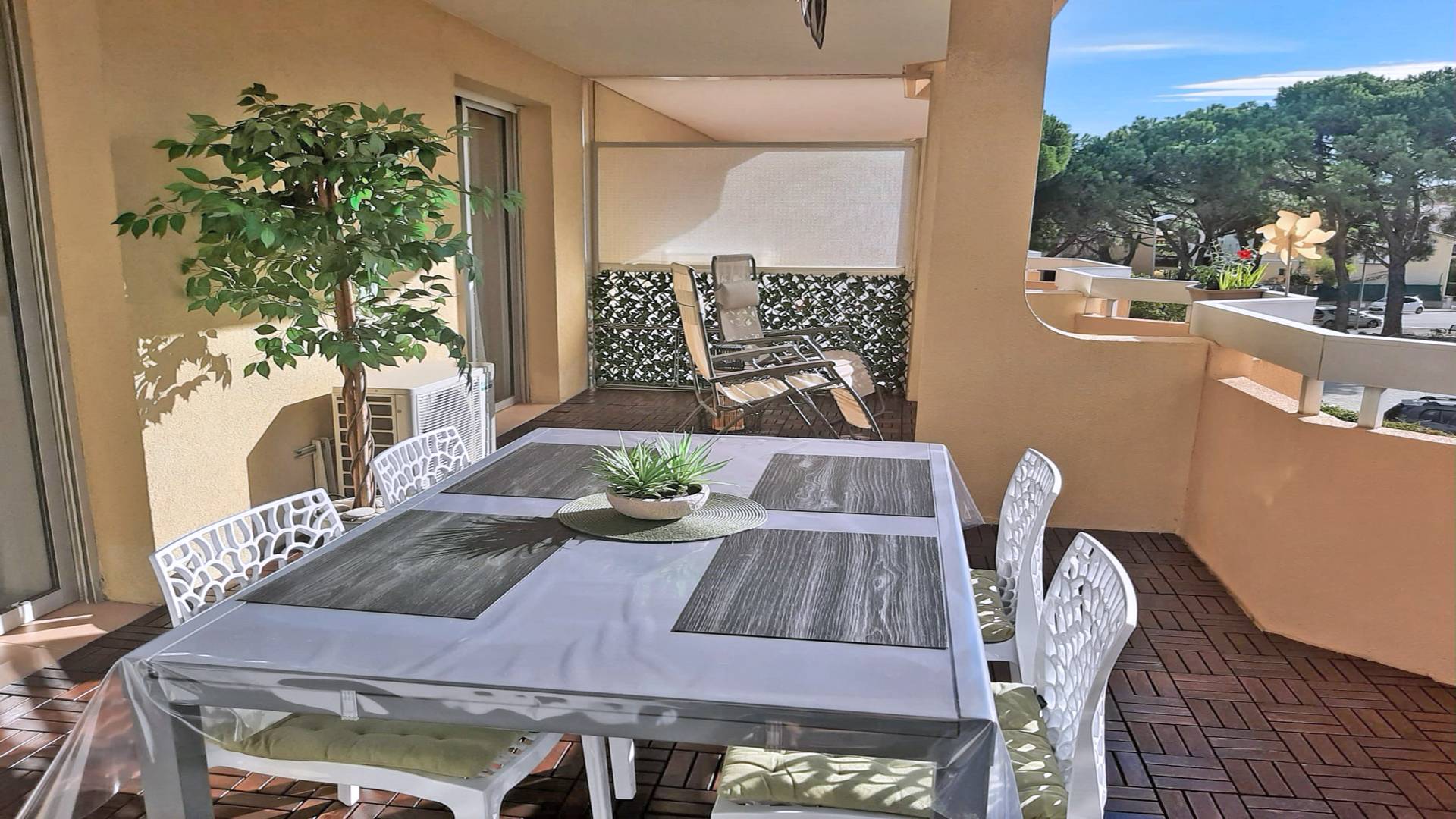- Belle pièce à vivre climatisée avec coin salon comprenant un canapé-lit convertible 140cm, une télévision écran plat et coin repas pour 4 personnes donnant accès à la grande terrasse équipée de 28m²
