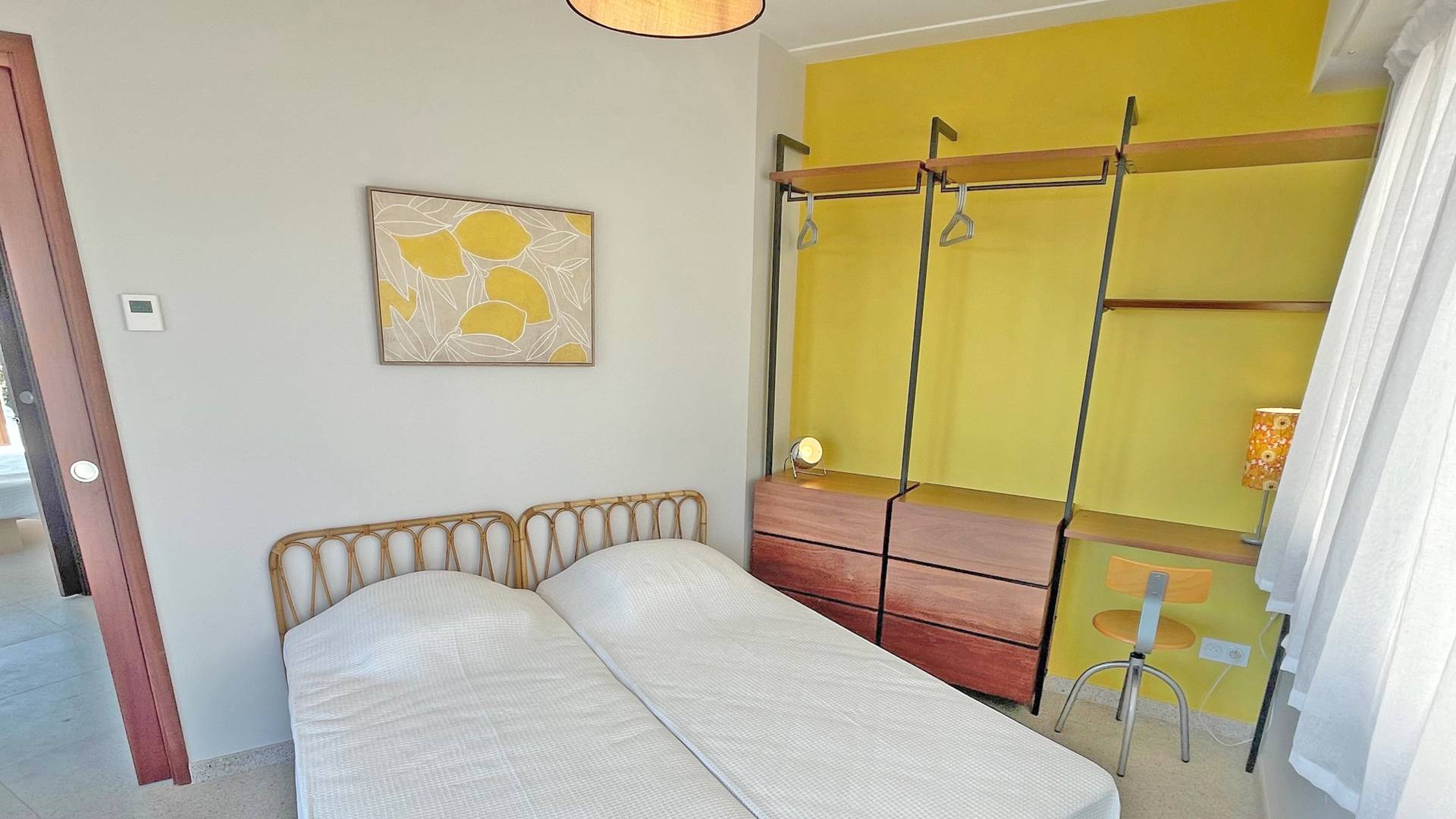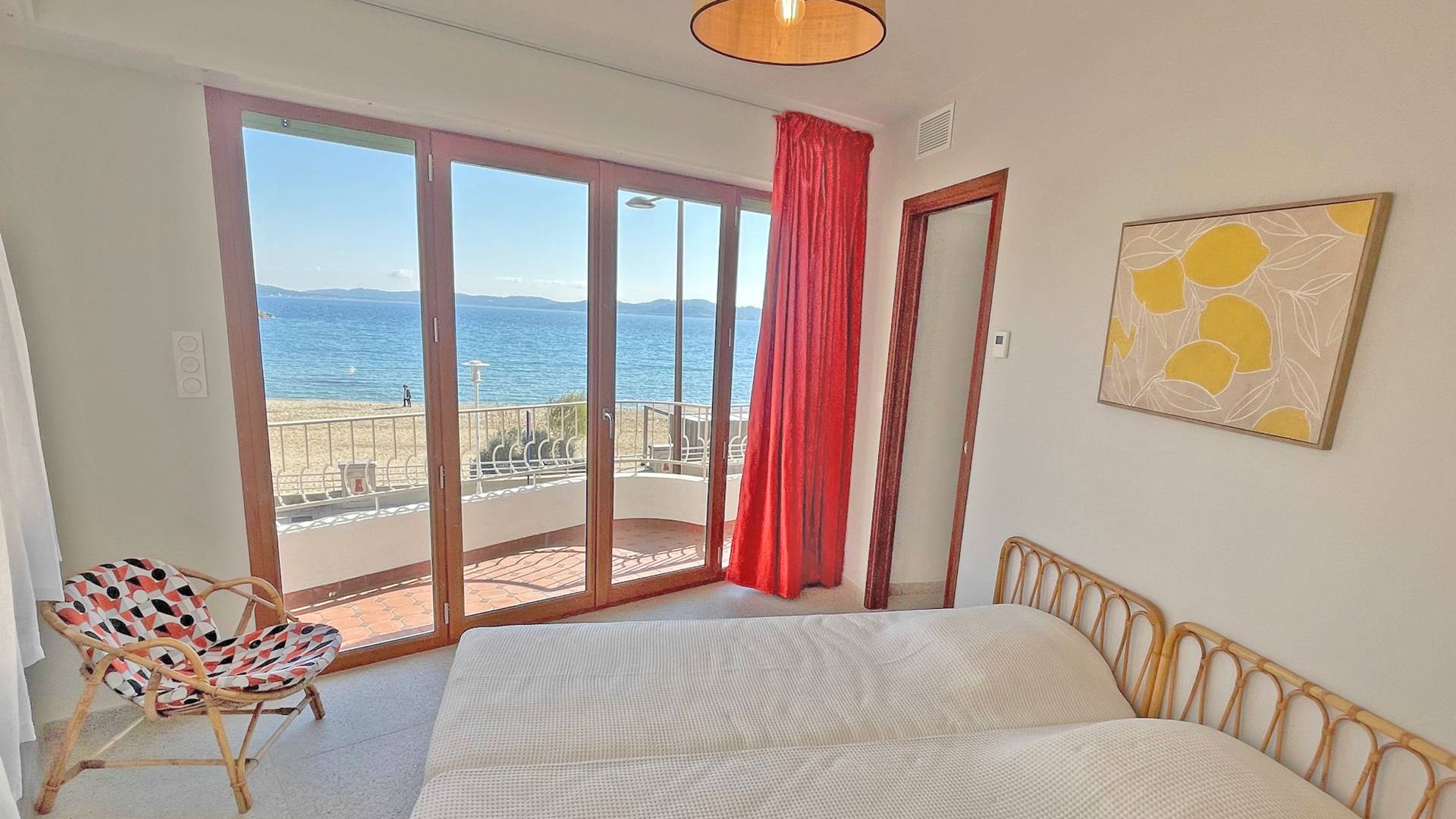 - Chambre 2 climatisée - vue mer : 2 lits en 80 avec penderie ouverte, commode et accès terrasse