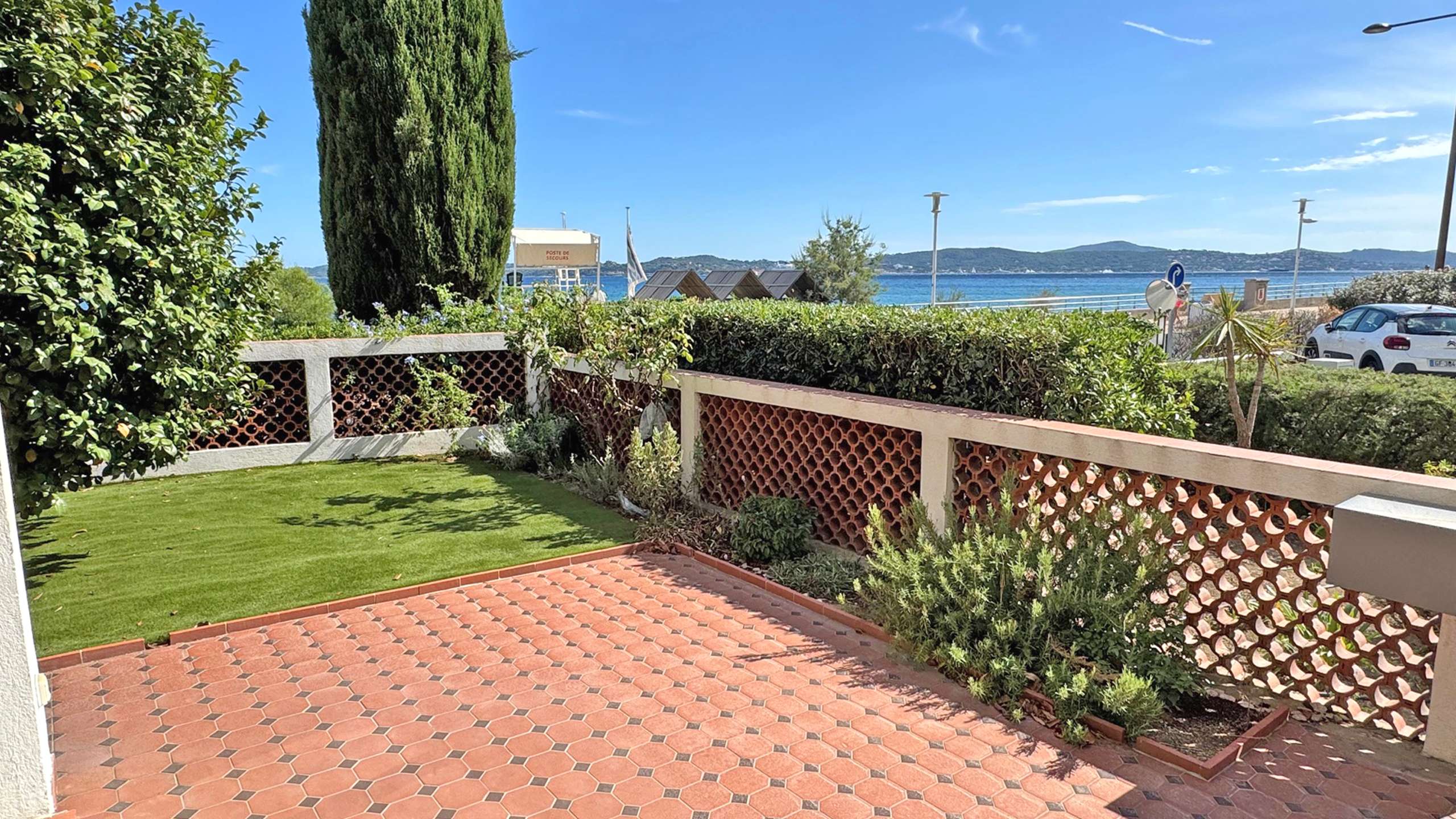 - Accès par la terrasse avant avec mobilier de repas, store banne et vue mer