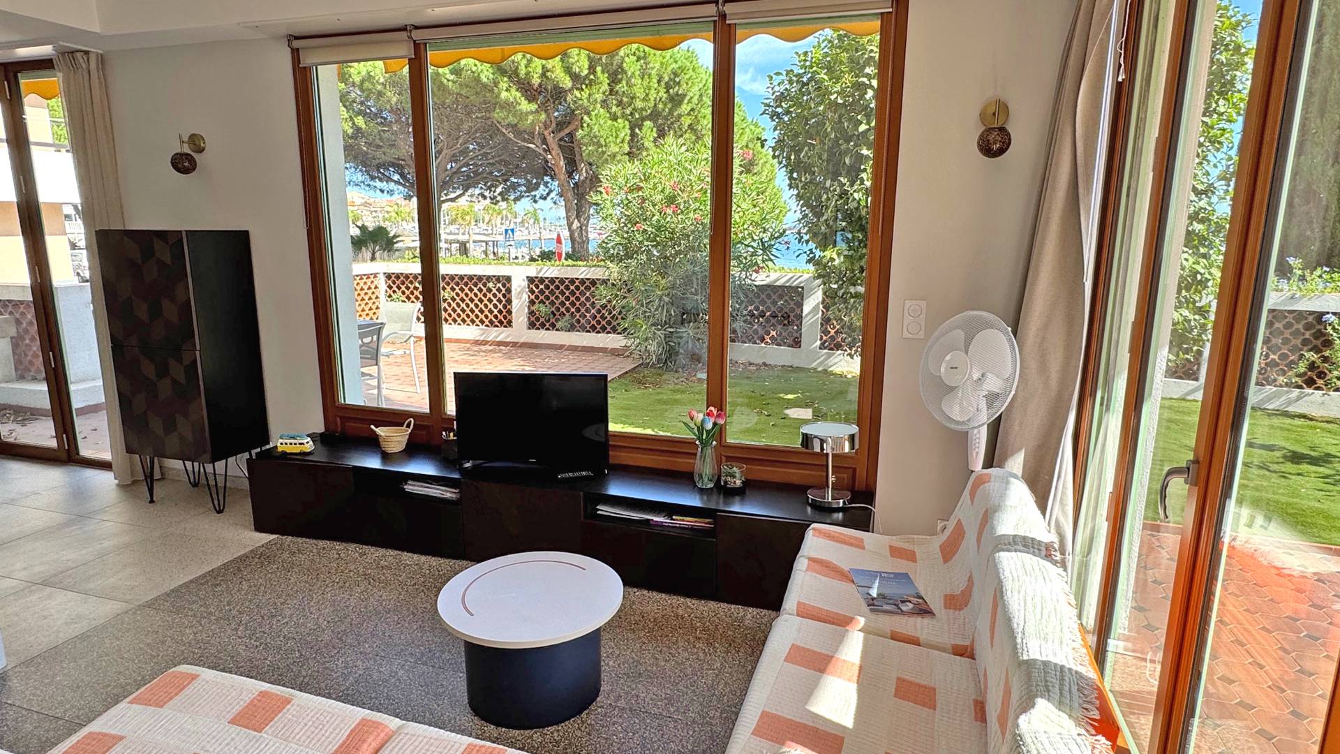 - Belle pièce à vivre climatisée : canapé et télévision écran plat, table de repas,vue mer
