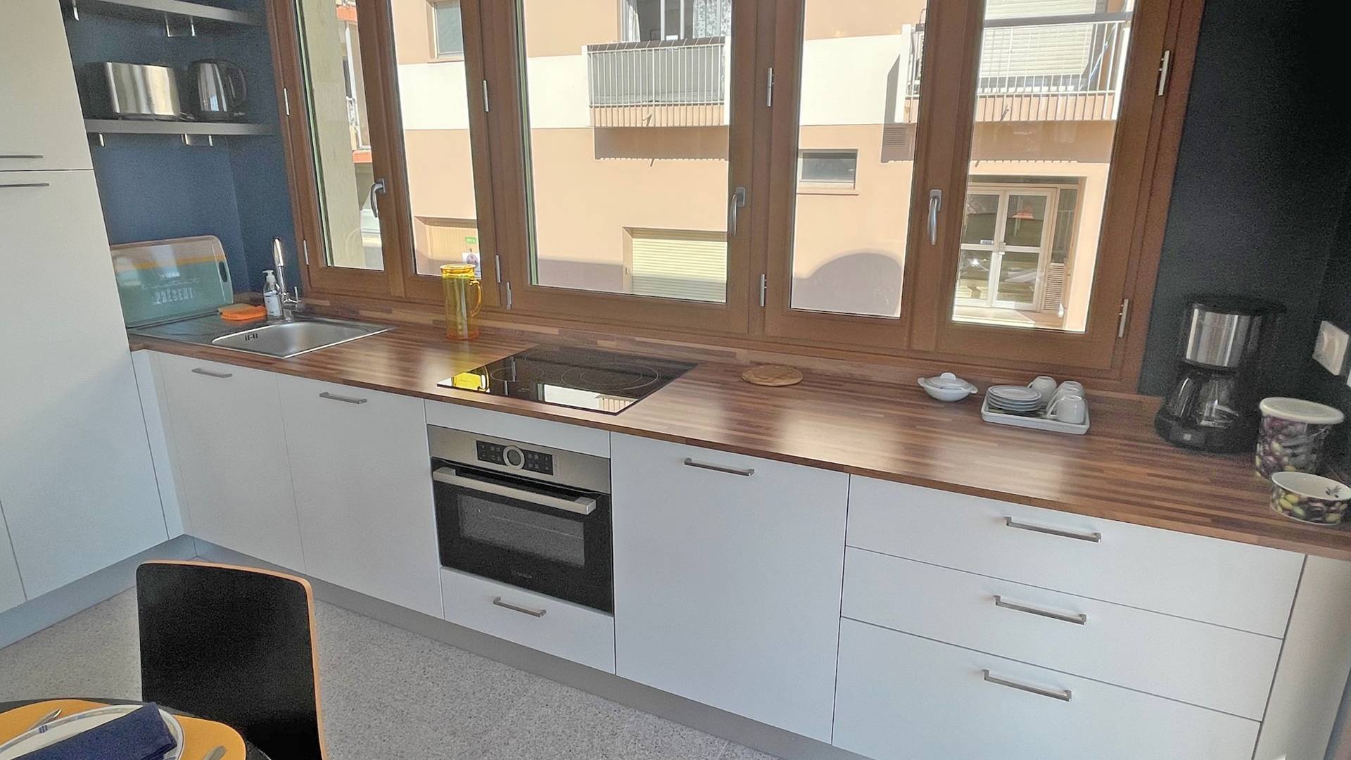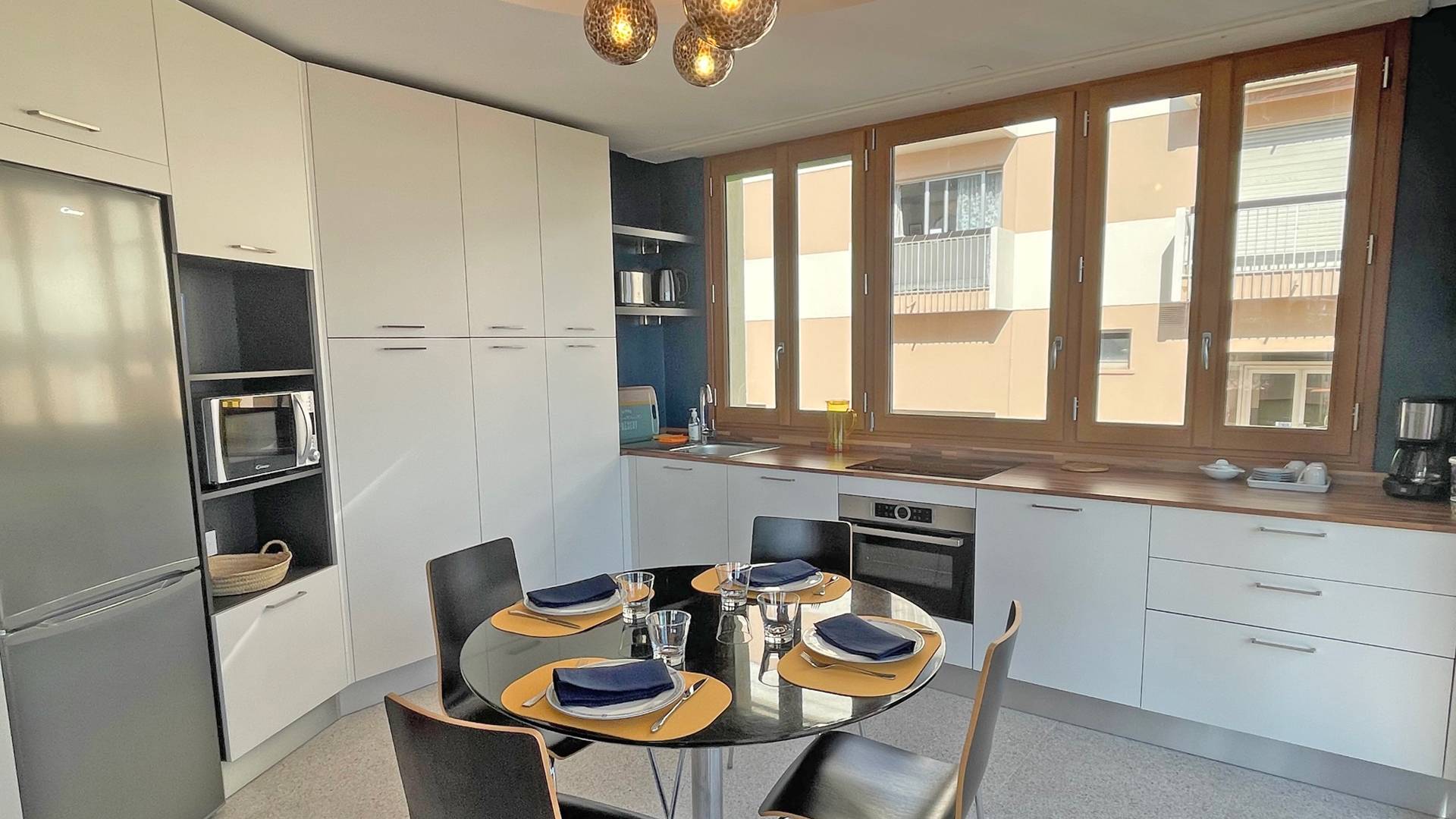 - Cuisine équipée (réfrigérateur, congélateur, lave-vaisselle, plaques de cuisson induction, four, micro-ondes, etc...) vue mer