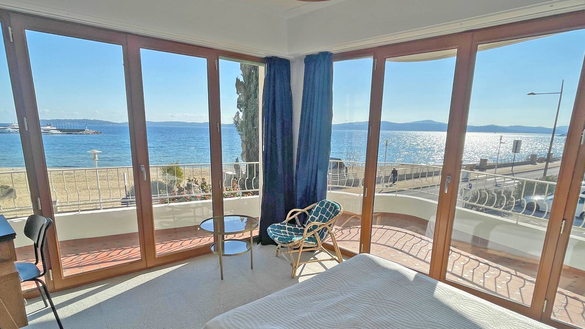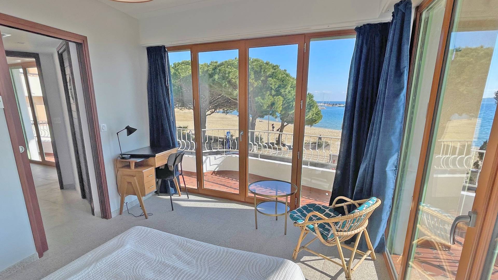 - Chambre 1 climatisée - vue mer : 1 lit 140 avec penderie ouverte, commode et accès terrasse