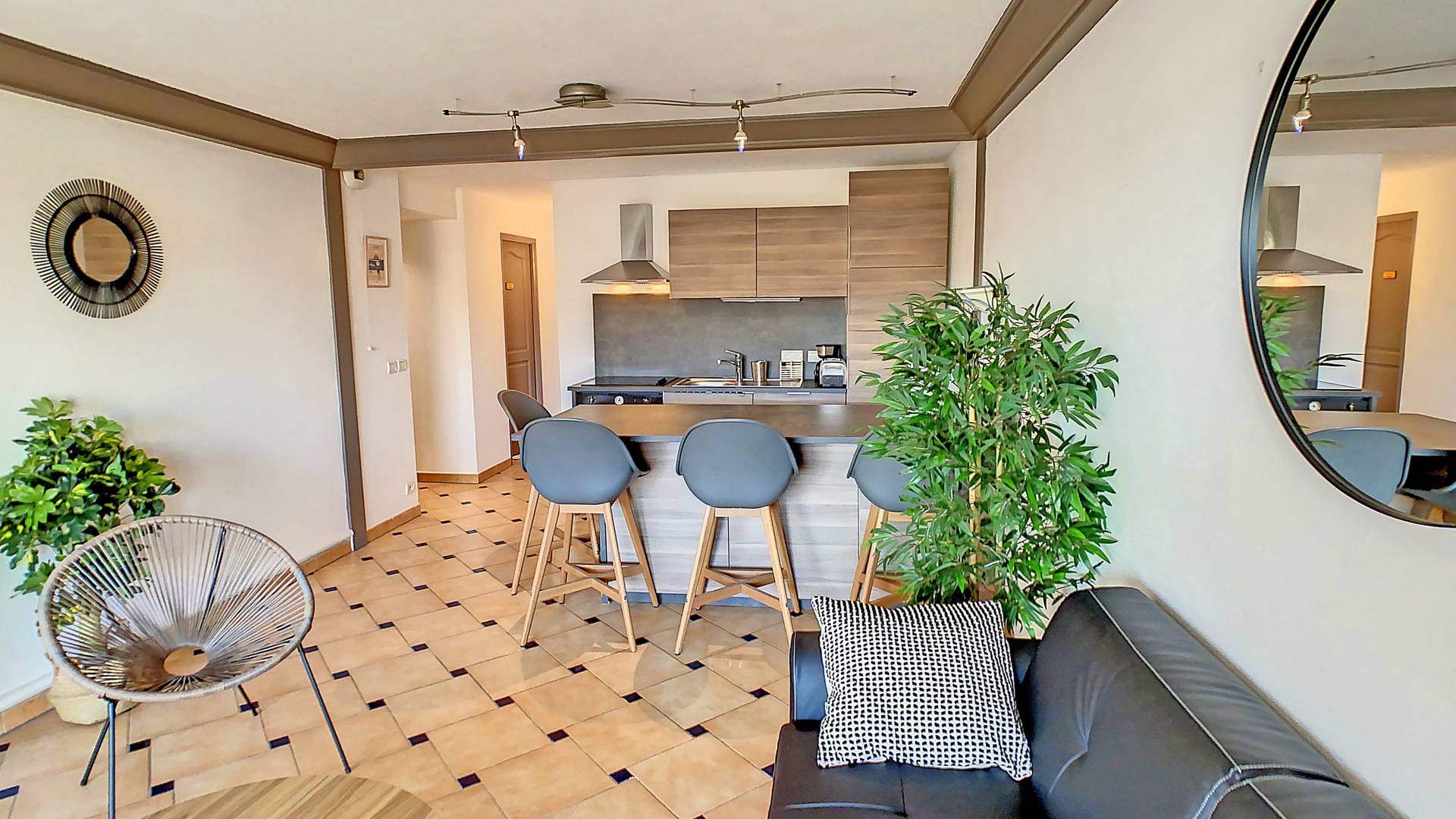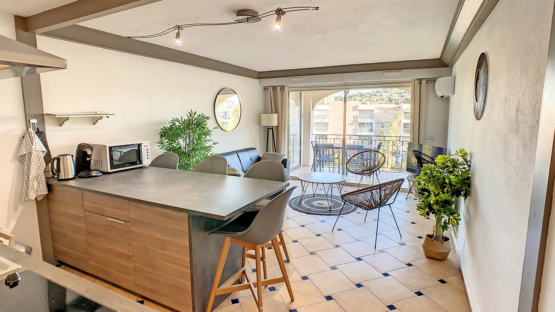 - Belle pièce à vivre climatisée comprenant salon avec canapé, table basse, TV, accès direct à la terrasse et espace repas avec table et chaises