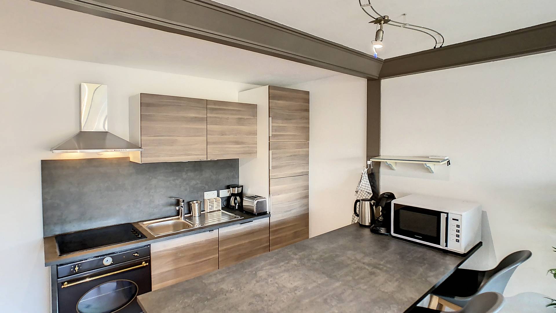 - Cuisine ouverte : plaque de cuisson induction 4 feux, bouilloire électrique, cafetière à dosettes Senseo, cafetière filtre, grille-pain, four micro-ondes, four électrique, réfrigérateur/congélateur, lave-vaisselle, vaisselle et ustensiles divers