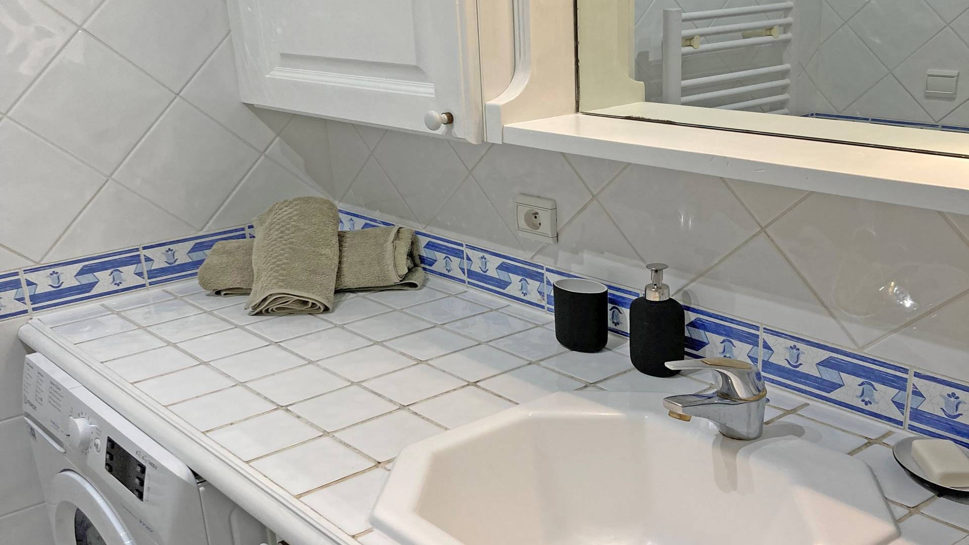- Salle de bains avec baignoire, lavabo, lave-linge/sèche-linge, sèche-serviettes, sèche-cheveux, placards