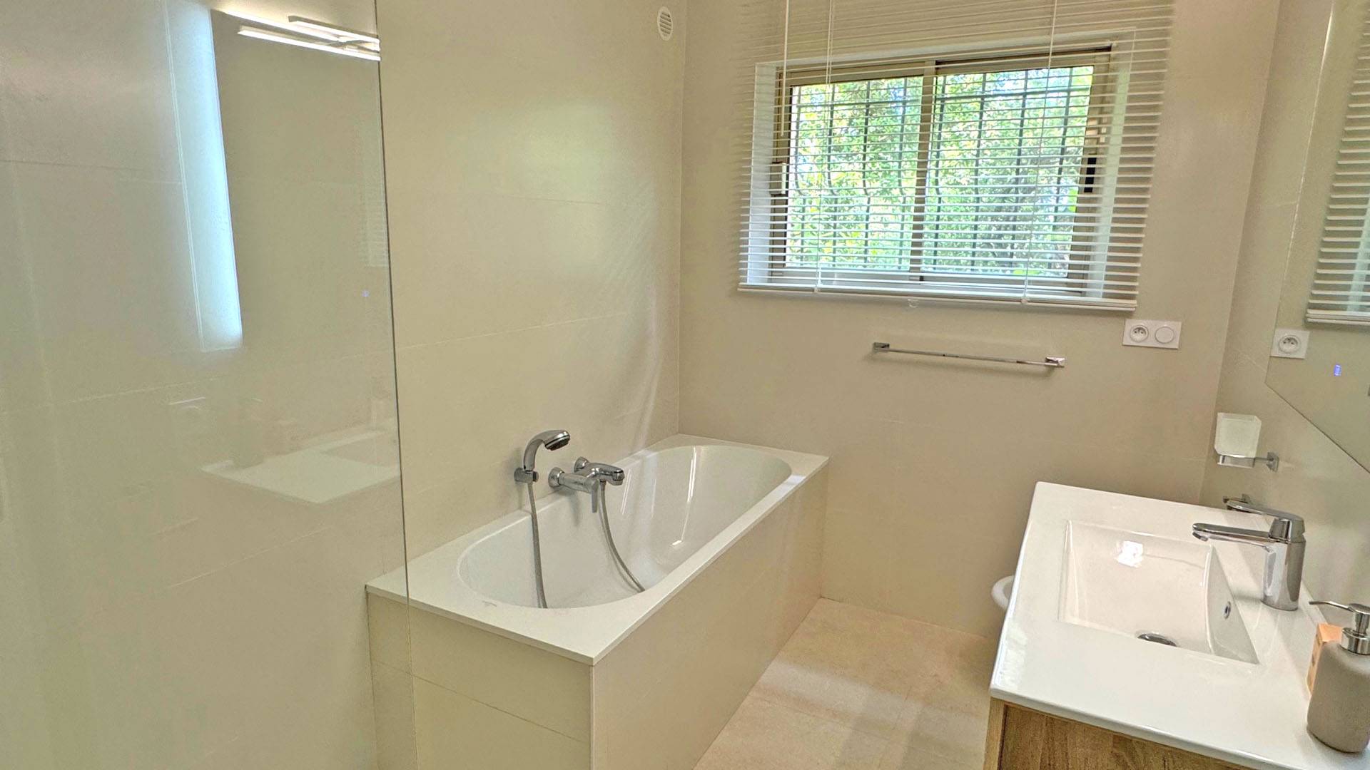 - Salle de bains avec douche à l'italienne, baignoire et meuble vasque