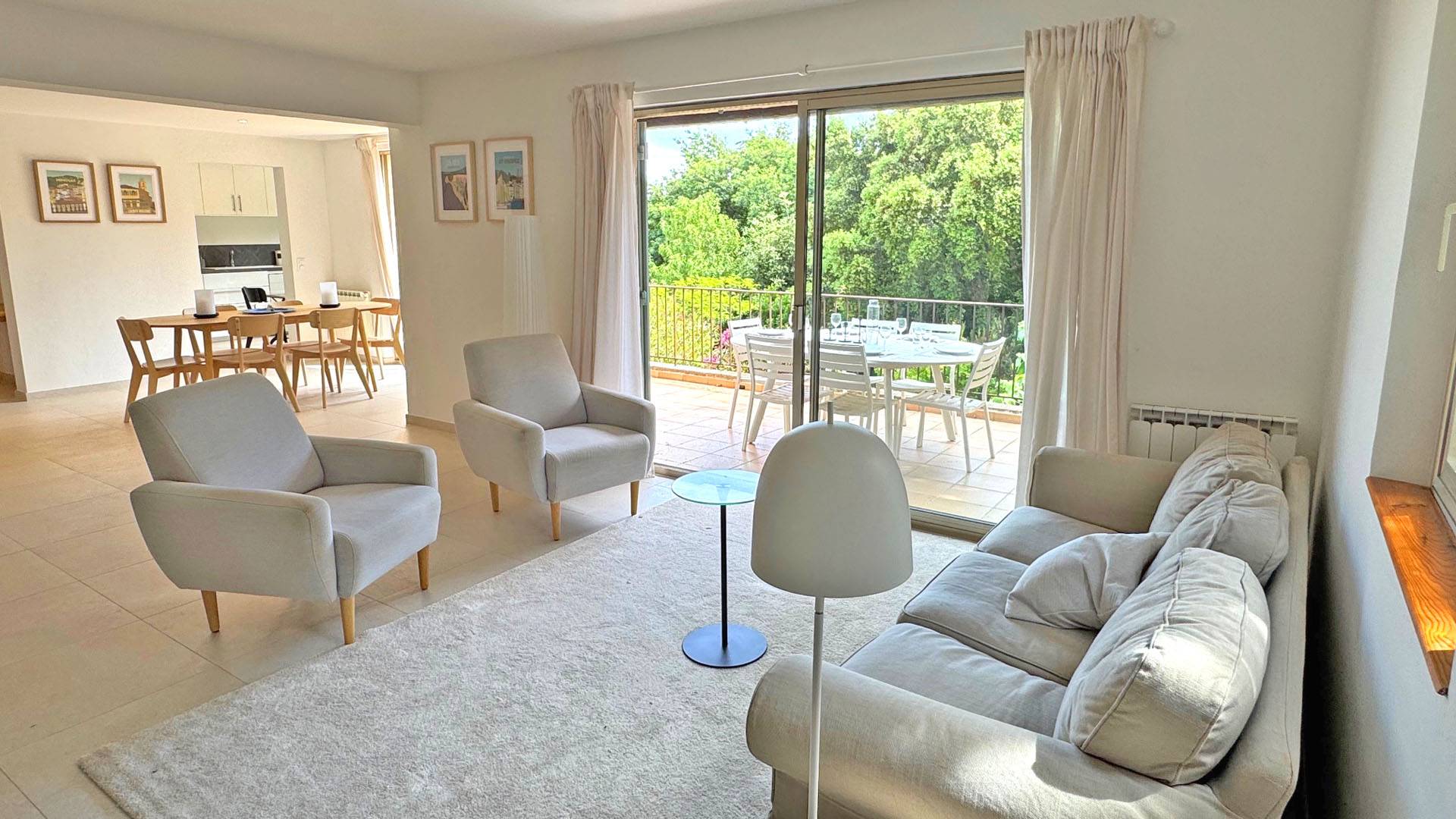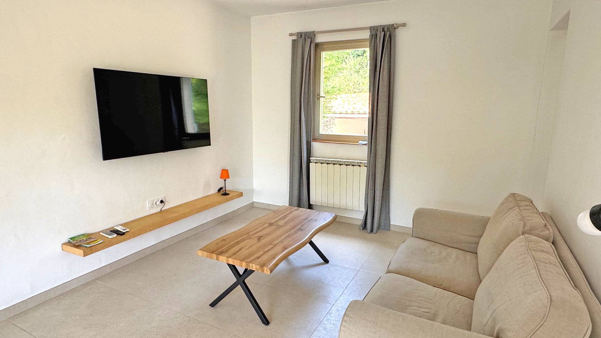 - Coin salon avec canapés, fauteuils, télévision et accès terrasse