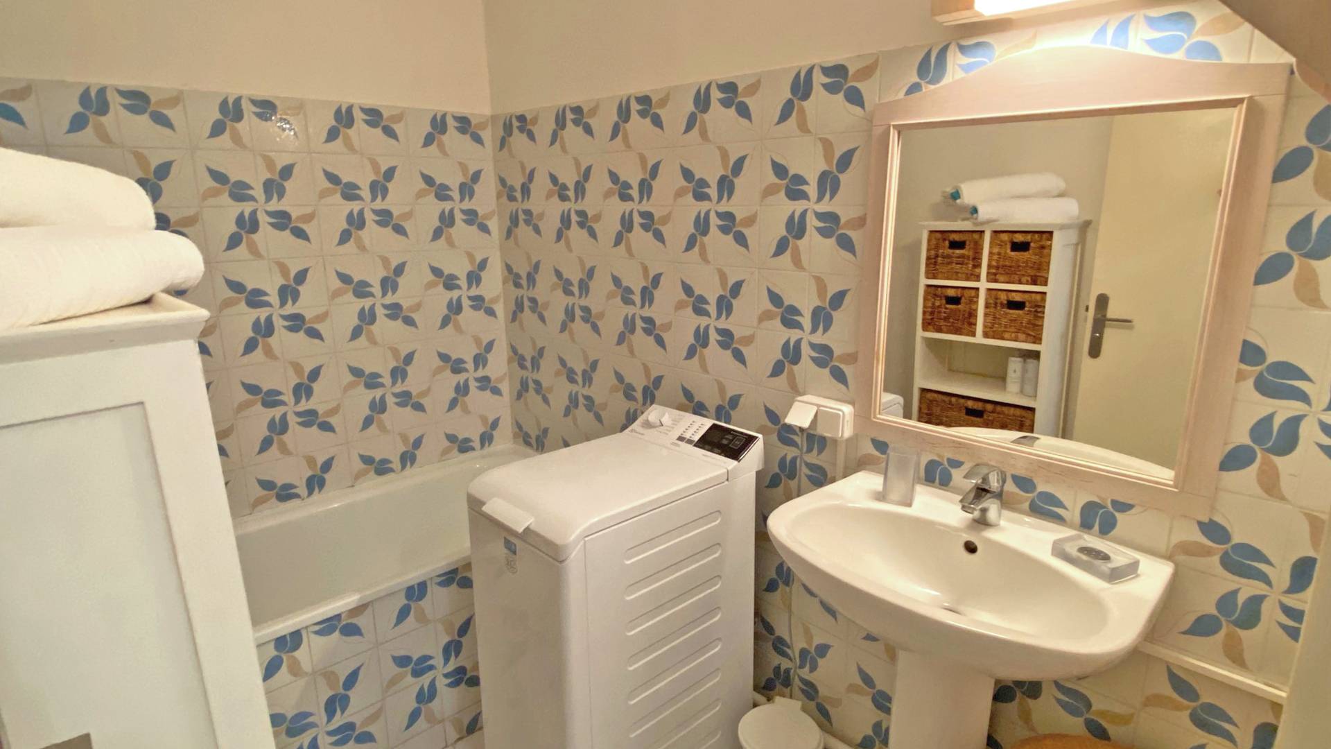 - Salle de bains avec baignoire, meuble vasque, lave-linge et sèche-cheveux