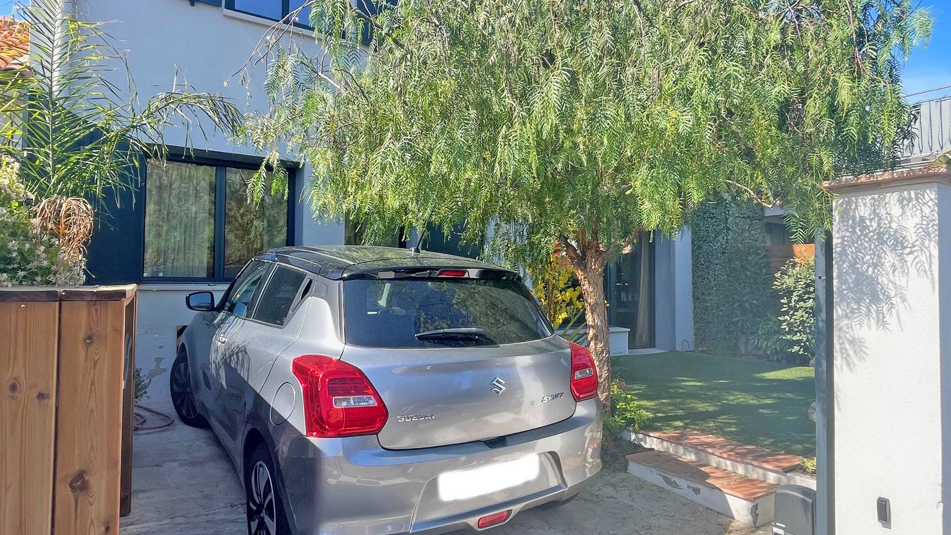 - D'un côté (entrée) : portail électrique, espace pour stationner un véhicule (longueur maximum 4,45m), herbes aromatiques, store banne
