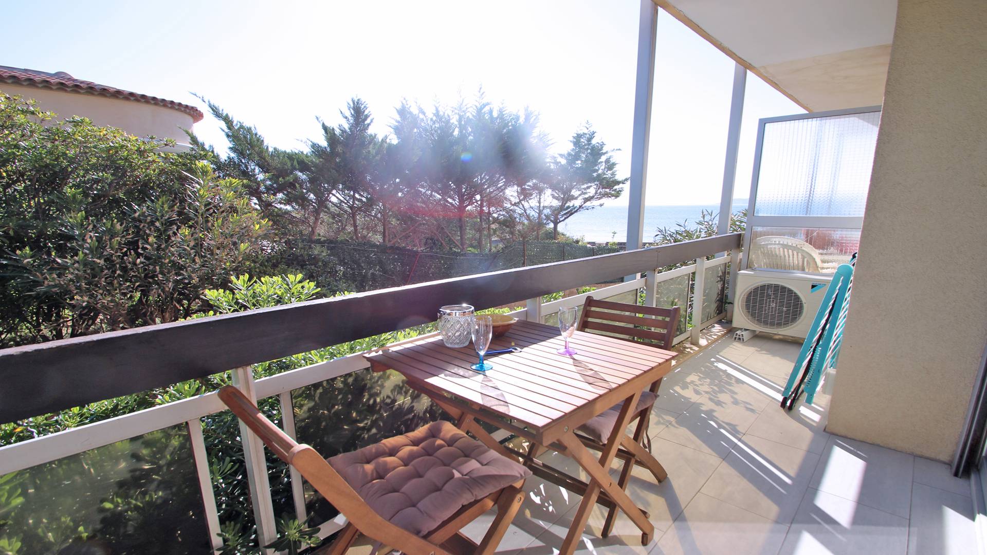 - Terrasse de 7m² avec mobilier de repas, étendoir à linge et vue mer