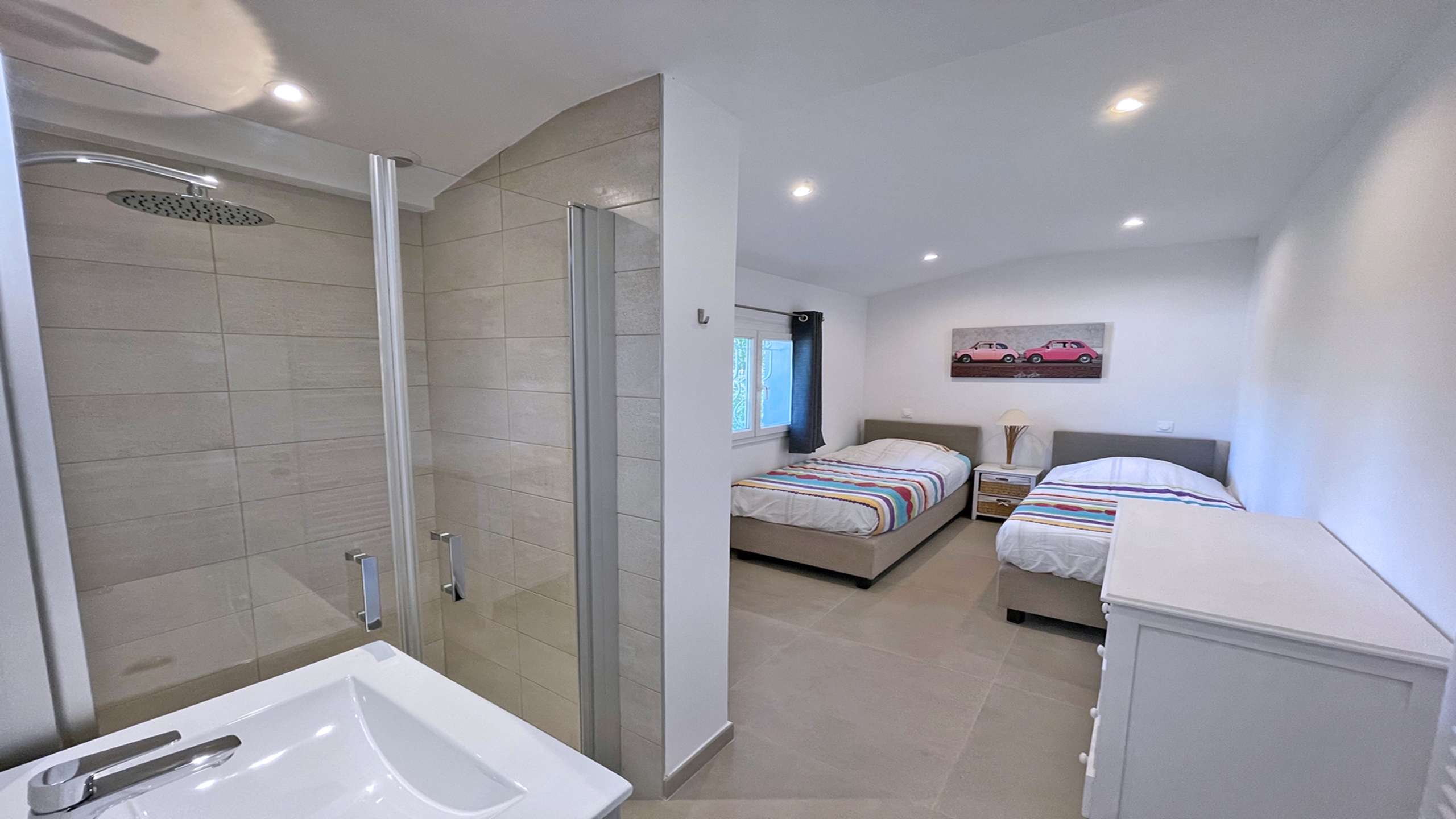- Chambre 3 climatisée : 2 lits simples 90x190 (ou 180cm), rangements et cabinet de toilette