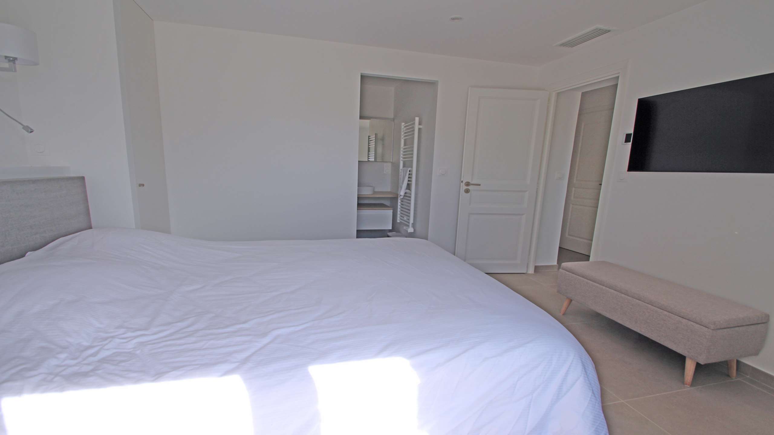 - Chambre 1 climatisée : Lit double 160x200 avec TV, placards et salle d'eau en suite (douche, lavabo) - Accès terrasse