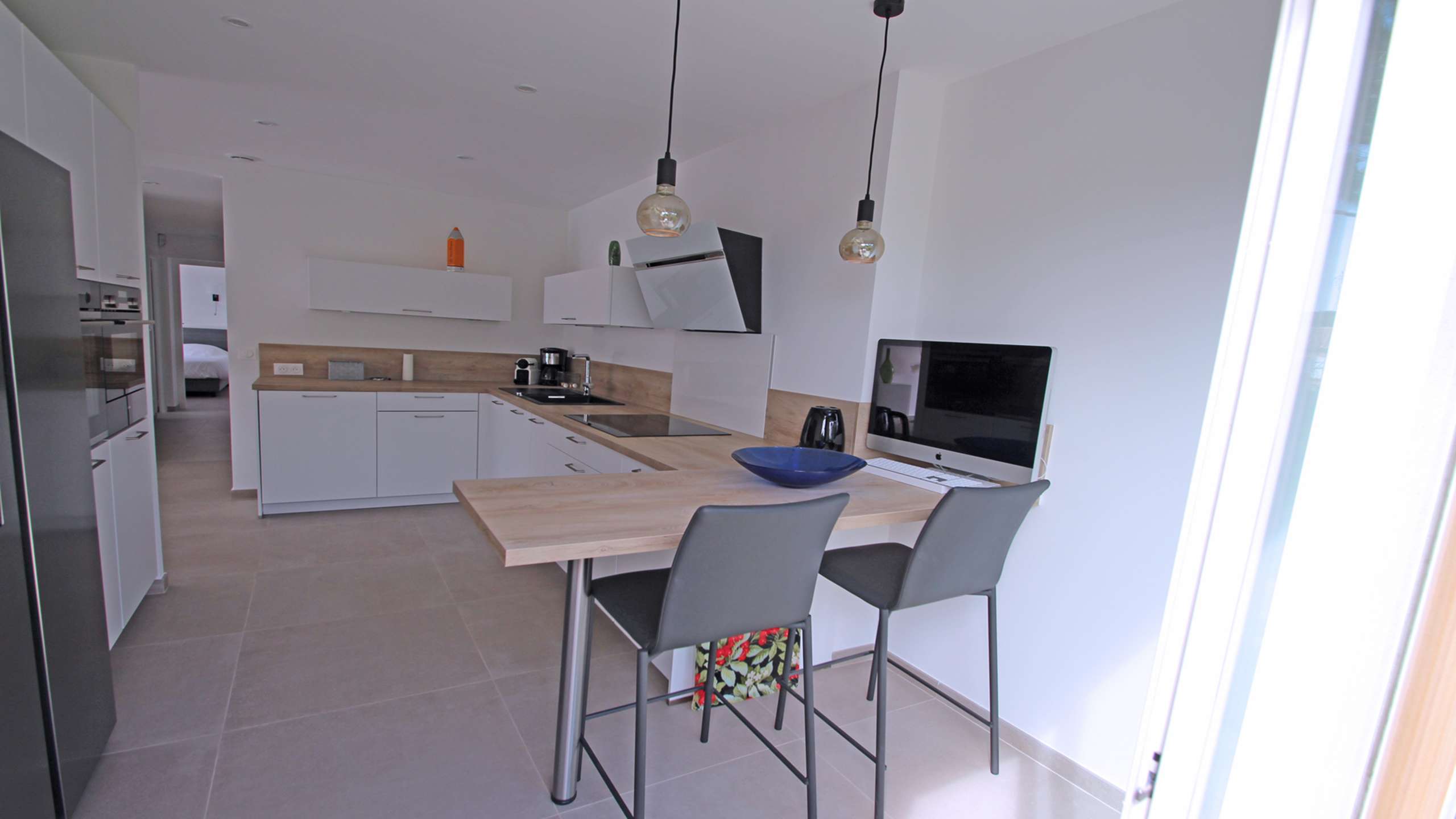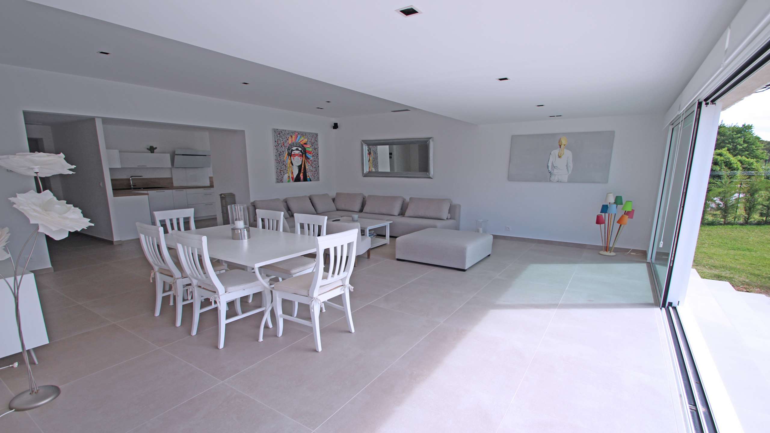 - Belle pièce à vivre climatisée donnant accès sur l'extérieur, répartie en 3 espaces : salon avec grand canapé d'angle et fauteuils pouvant accueillir tous les convives, grand écran TV, coin repas, et la cuisine ouverte très bien équipée (Réfrigérateur américain / congélateur, plaque de cuisson, hotte aspirante, lave-vaisselle, four, four micro-ondes, vaisselle diverse)