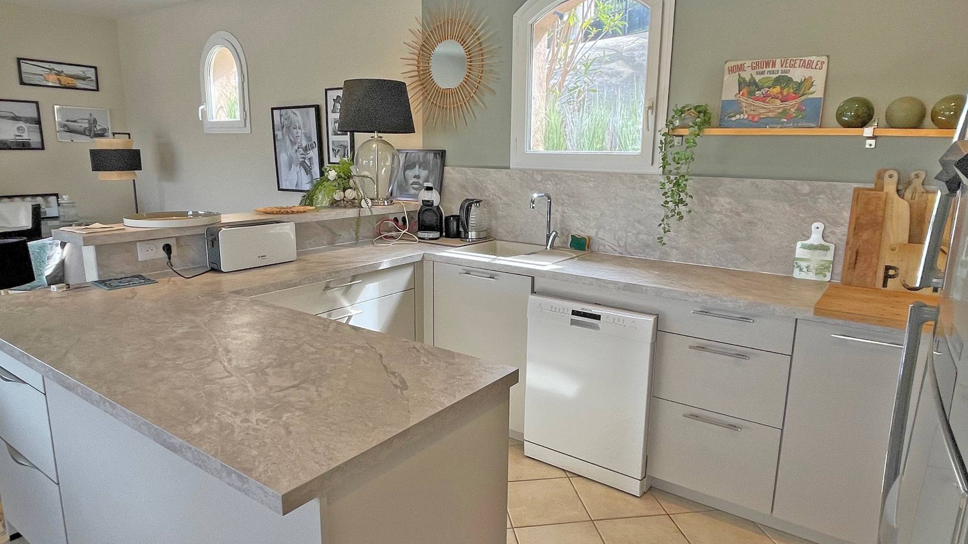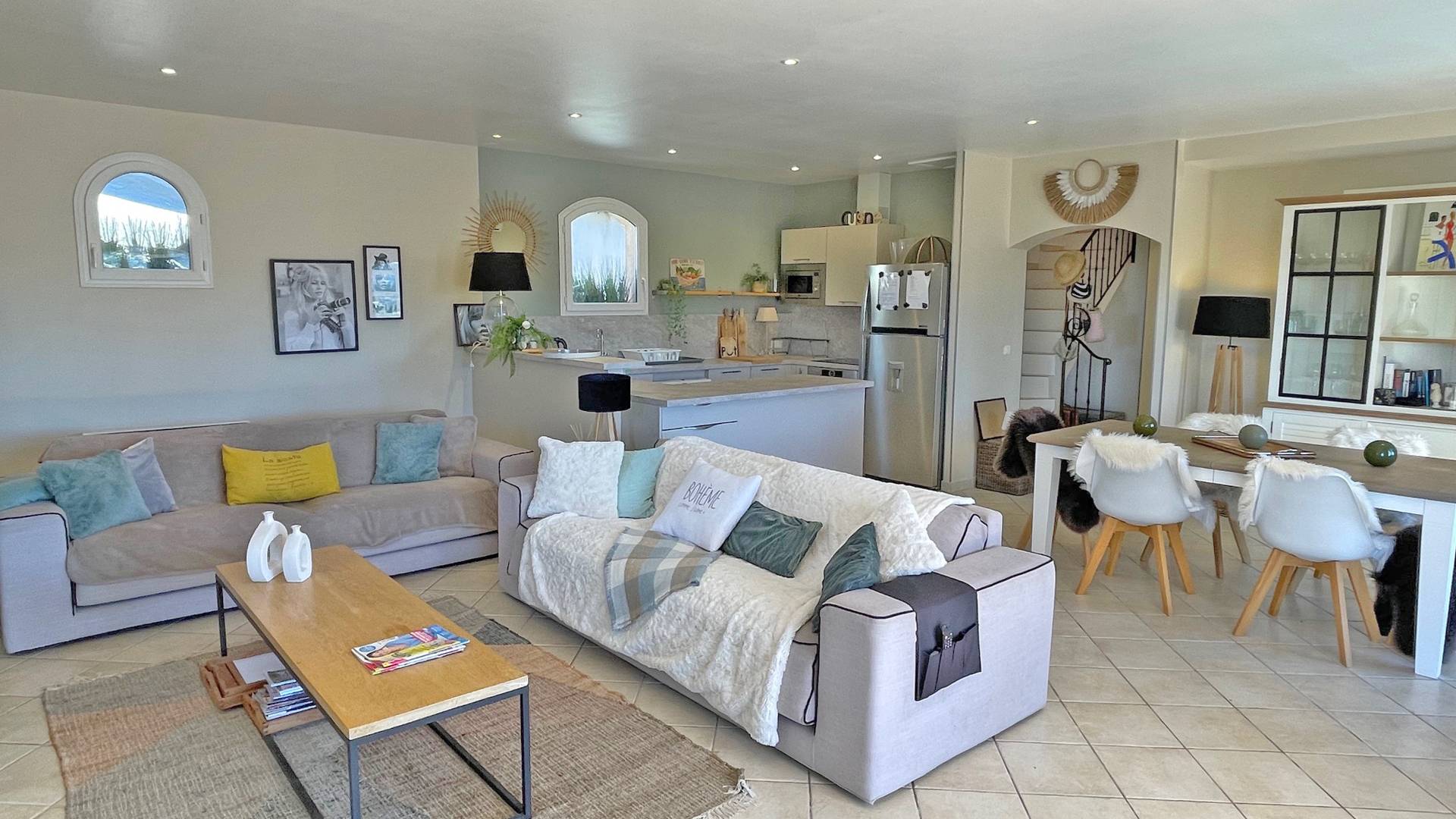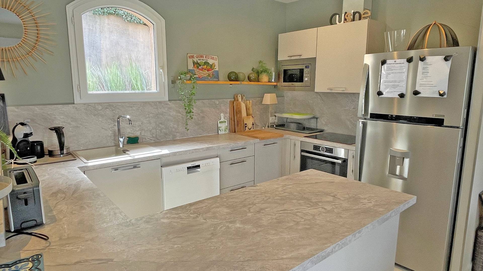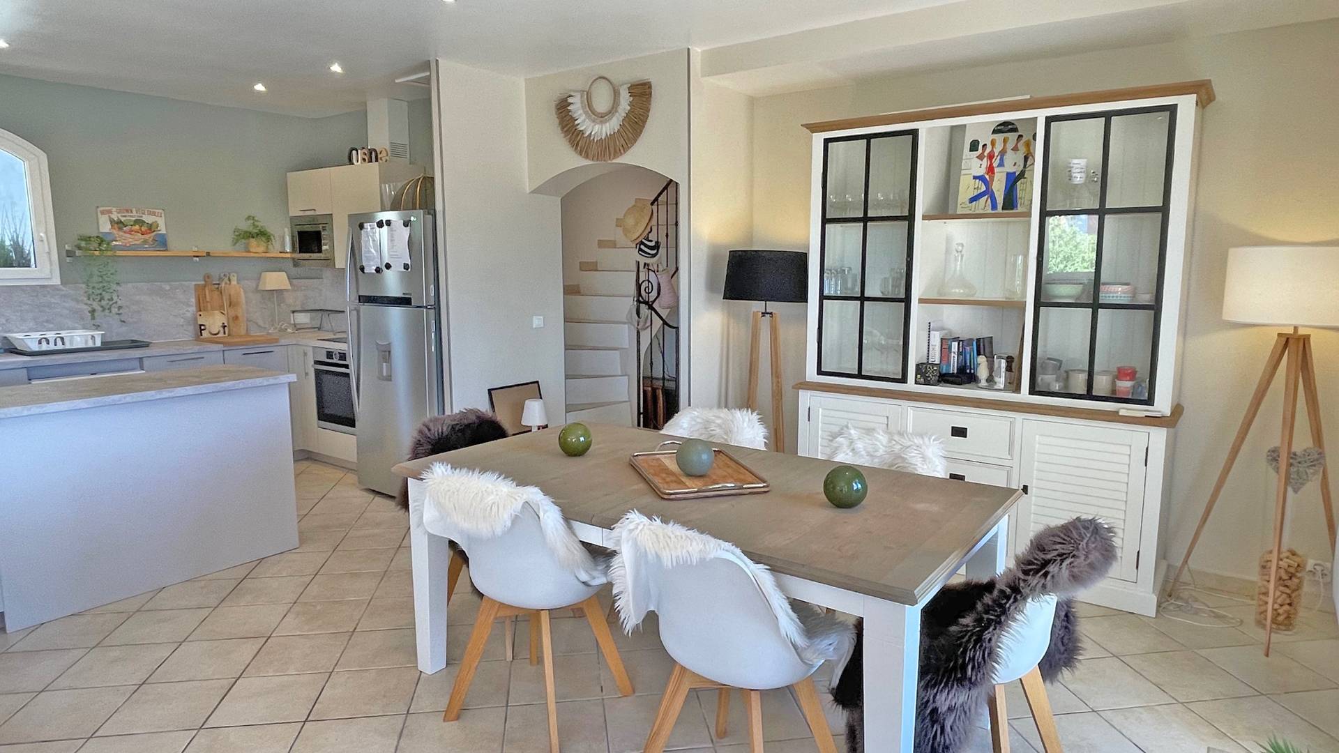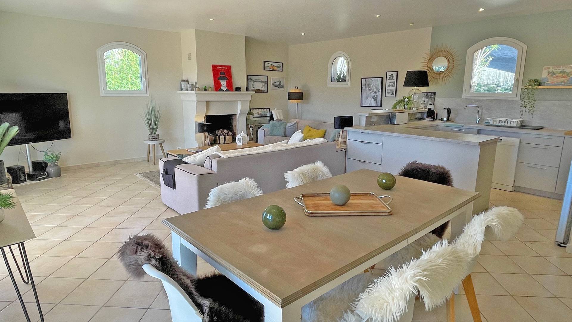 - Belle pièce à vivre climatisée donnant accès sur l'extérieur, répartie en 3 espaces : salon avec 2 canapés pouvant accueillir tous les convives, grand écran TV, le coin repas pour 8 personnes et la cuisine américaine très bien équipée (réfrigérateur, congélateur, plaques de cuisson, hotte aspirante, lave-vaisselle, four, micro-ondes, vaisselles diverses)