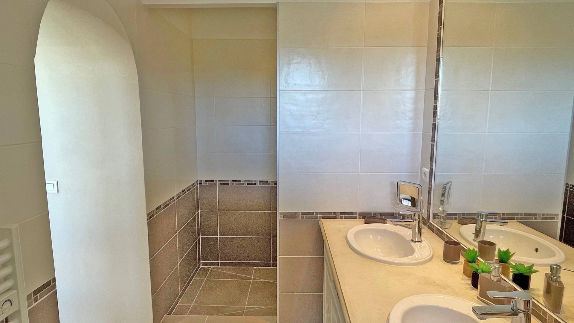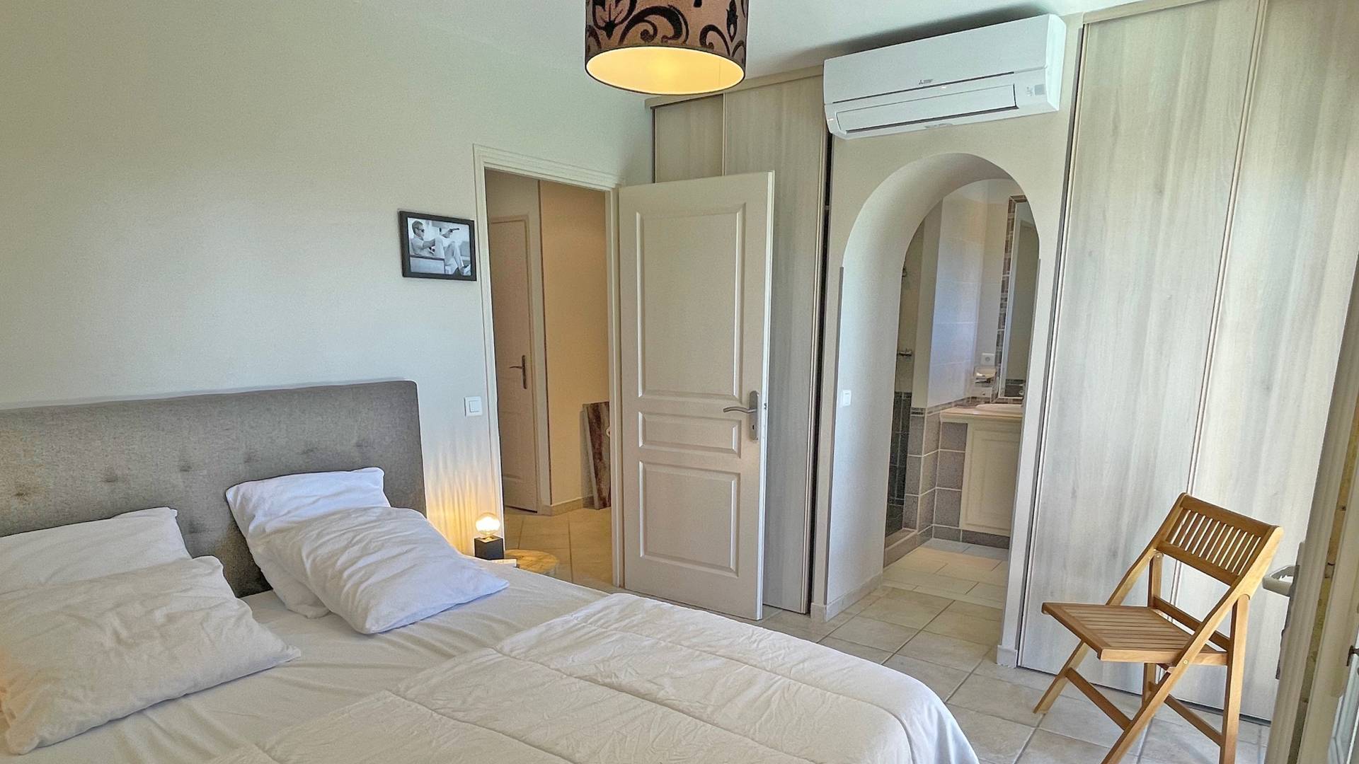 - Chambre 1 climatisée : Lit double 160x200 avec placards et salle d'eau en suite à partager (douche, lavabo) - Accès terrasse