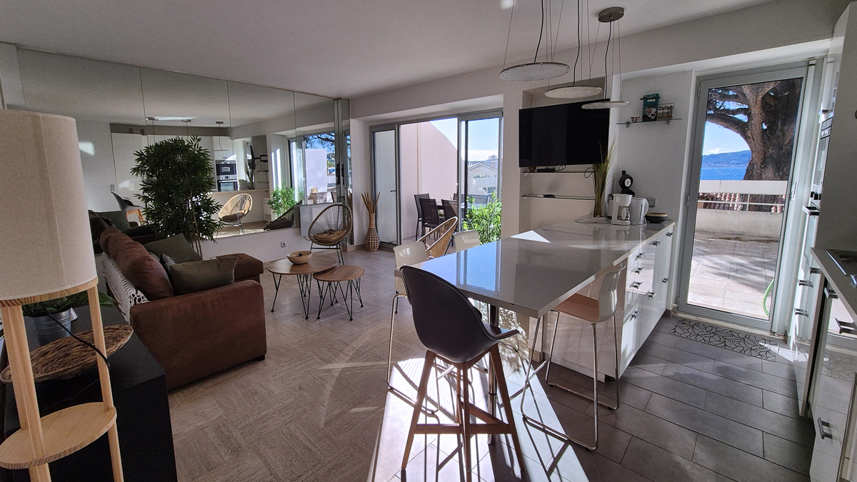Superbe et lumineux appartement duplex de 80m², rénové avec goût, comprenant entrée, vaste pièce de vie ouvrant sur une terrasse de 45m² et sa vue sur la mer et le port, en étage 2 chambres avec très belle vue mer, salle d'eau avec toilettes. Une cave complète ce bien. Possibilité de garage en sus.
